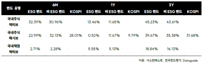또한 사회적 논란이 큰 주류·담배·도박 업종의 편입 비중이 낮은 것도 유효하게 작용했다는 분석이다. ESG 펀드에서 비윤리적 종목 편입 비중은 0.5%로, KOSPI(1.63%)와 비ESG펀드(1.80%) 대비 크게 낮았다. 서스틴베스트는 "단기 수익을 위해 비윤리적 종목에 투자하는 관행이 줄고, 사회적 가치와 연계된 투자 원칙이 점차 제도권 금융에 자리 잡고 있음을 단편적으로 보여줬다"고 설명했다.