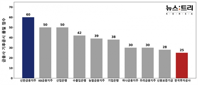 20일 뉴스트리는 신한·KB·하나·우리·농협금융지주와 산업은행, 기업은행, 수출입은행, 신용보증기금, KIC 등 국내 주요 금융사 10곳을 대상으로 '기후·ESG 공시' 수준을 비교하는 '공시 품질 평가'를 진행한 결과, 신한금융지주는 60점, KB금융지주·산업은행은 50점, 수출입은행은 42점, 농협금융지주는 39점, 기업은행은 38점, 하나금융·우리금융은 30점, 신용보증기금은 28점, KIC는 25점 순으로 나왔다.