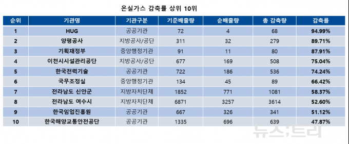 공공부문 온실가스 감축실적에서 주택도시보증공사(HUG)가 감축률이 가장 높았고, 보령시시설관리공단·목포해양대학교·기초과학연구원(IBS) 등은 배출이 더 늘어나 감축률 최하위를 기록했다.