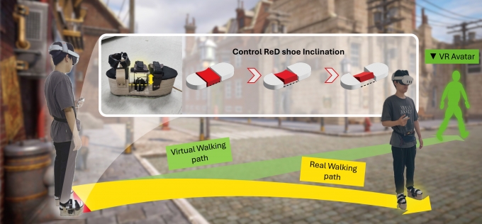 이에 연구팀은 이같은 문제를 해결하기 위해 발바닥에 전달되는 '기울기 촉각 피드백'을 활용, 감각 불일치를 줄이는 보행 인터페이스를 개발했다. 이는 VR 보행 중 시각과 전정 감각을 정밀하게 맞춰 좁은 현실에서도 넓은 가상공간을 걷는 듯한 자연스러운 체험 구현이 가능했다.