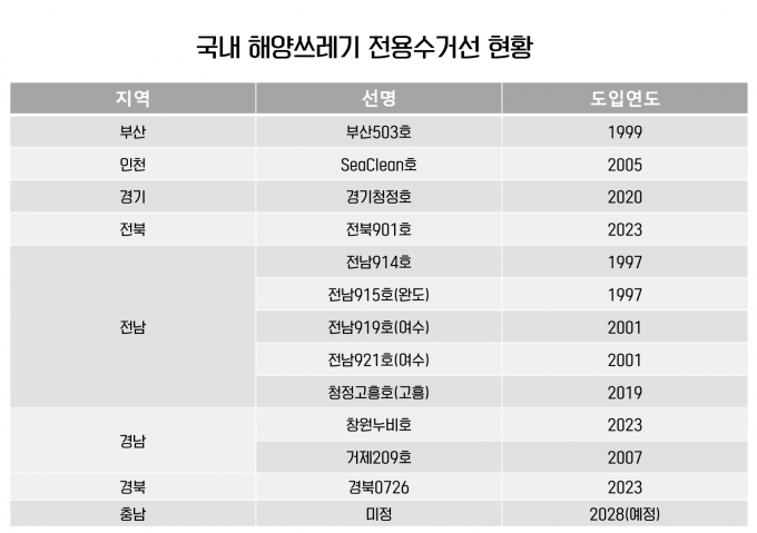 현재 우리나라에서 운항되는 '해양쓰레기 전용수거선'은 12척이다. 전남이 5척(총 531톤 규모), 경남이 2척(총 104톤 규모), 경북이 1척(171톤), 전북이 1척(170톤), 경기가 1척(154톤), 부산이 1척(118톤), 인천이 1척(85톤)을 운항중이다. 충남이 1척을 건조해 2028년부터 운항을 시작하면 13척으로 늘어난다.