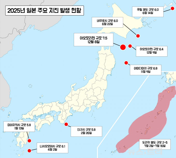 한국지질자원연구원 관계자는 뉴스트리와 통화에서 올해 환태평양 지진대에서 관측된 지진 빈도 증가와 강진의 위치·규모를 종합할 때 "당장은 아닐지라도 중장기적으로 더 큰 지진이 발생할 가능성을 배제할 수 없다"면서 "일본뿐 아니라 주변 국가들도 위험 정보를 공유하고 대비 체계를 재점검해야 한다"고 강조했다.