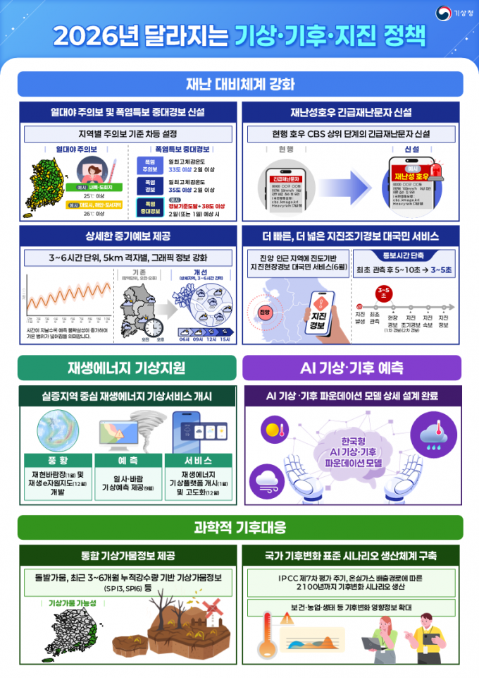 기상청은 폭염·호우·대설·강풍·한파 등 위험기상 발생 확률을 4단계로 나눠 2∼3일 전 안내하는 '위험기상 확률 정보'도 내년 6월부터 제공한다. 또 향후 열흘 날씨 예측을 담은 '중기예보'는 내년 11월까지 '3∼6시간 5㎞ 격자 단위'로 현재(오전·오후 광역 시도 단위'보다 정밀하게 바꾸고 2027년엔 예측 기간을 2주로 늘리기로 했다.