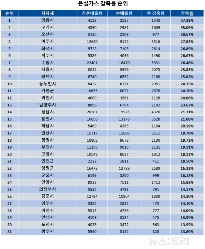 ▲경기도 지자체 온실가스 감축률 순위 ©newstree