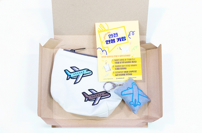 이번에 기부한 안전인형 키링은 대한항공 기내 테이블보를 활용해 긴급상황시 경고음을 내 도움을 요청할 수 있도록 제작됐다. 평상시엔 가방에 달고 다니다가 위급상황이 생겼을 때 인형을 잡고 고리를 당기면 경고음이 울린다. 파우치는 대한항공 기내 테이블보와 양사 객실승무원이 반납한 유니폼으로 만들어졌다.