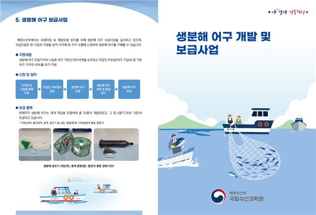 수과원은 '생분해 어구 보급사업' 활성화를 위해 생분해 어구의 성능인증 및 품질검사를 실시하고 있다. 어민들은 해당 지자체나 지구별 수협에서 생분해 어구를 신청하면 된다.