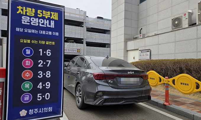 ▲ 25일 청주시의회 정문에 세워진 차량 5부제 운행 안내문 (사진=연합뉴스)