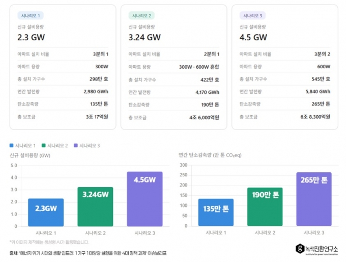 녹색전환연구소가 8일 발간한 '이슈브리프'에 따르면 가정용 태양광 설비 확대로 최대 4.5GW의 재생에너지 설비를 확보하게 된다면 연간 탄소배출량을 최대 265만톤 감축할 수 있는 것으로 나타났다. 이는 인구 49만명인 인천 부평구의 탄소배출량과 맞먹는다.