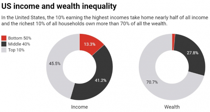 현재 미국내 부의 불평등은 소득 불평등보다 더 심각한 수준이다. 소득의 경우 상위 10%가 전체 소득의 45.5%를 가져가는 반면, 부에서는 상위 10% 부유층이 전체 부의 70.7%를 차지하고 있다. 반대로 하위 50%가 소득과 부를 가져가는 비중은 각각 13.3%와 1.5%에 불과했다.