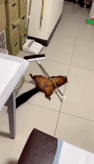심지어 처음에 배 쪽에 있던 빗자루를 목 위로 끌어올리거나 죽은 것처럼 다리를 쭉 뻗고 누가 보고 있는지 주변을 살피는 등 귀여운 모습을 보였다. 영상을 올린 게시자는 "나는 사랑에 빠진 것 같다"고 할 정도로 날다람쥐의 행동은 귀여움의 극치였다.