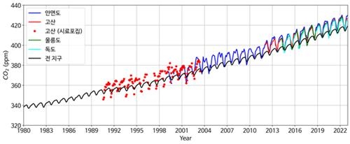 지난해 고산과 울릉도 기후변화감시소 이산화탄소 농도도 각각 423.5ppm과 422.8ppm을 기록해 역대 최고치였다. 2021년의 421.5ppm과 420.8ppm보다 2.0ppm 높아졌다.