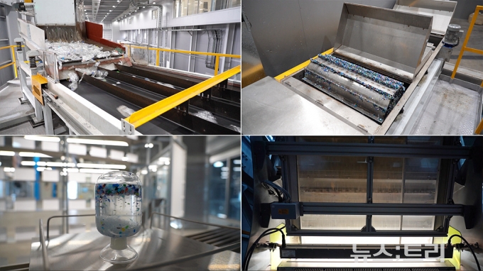 라벨 스트리퍼를 통과한 페트병은 빠르게 돌아가는 4개의 컨베이어 라인으로 보내진다. 각 라인마다 설치돼 있는 AI 카메라는 이물질을 빠르게 걸러낸다. 실제로 기자가 라인 위로 명함을 던져넣으니 라인 하단 사출구에서 바람이 나와 걸러냈다. 컨베이어 라인을 거친 페트병은 '분쇄룸'으로 향한다. 분쇄룸에서는 페트병을 잘게 자른다. 이 과정에서 먼지나 미세플라스틱이 발생하지 않도록 물속에서 공정이 진행된다. 이를 습식분쇄라고 한다.
