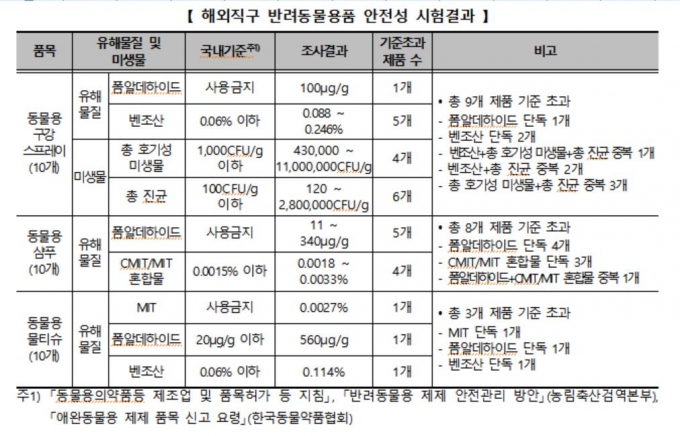 조사대상 반려동물용품 30개 중 20개(66.7%) 제품에서 국내 기준을 초과하는 유해물질과 미생물이 검출됐다. 동물용 구강 스프레이 10개 중 6개(60.0%) 제품에서 사용금지된 폼알데하이드와 국내 기준(0.06% 이하)을 초과하는 벤조산(0.088~0.246%)이 검출됐다. 또 6개(60.0%) 제품에서는 국내 기준(총 호기성 미생물 1000CFU/g 이하, 총 진균 100CFU/g 이하)을 초과하는 총 호기성 미생물(43만~1100만CFU/g)과 총 진균(120~280만CFU/g)이 검출됐다.
