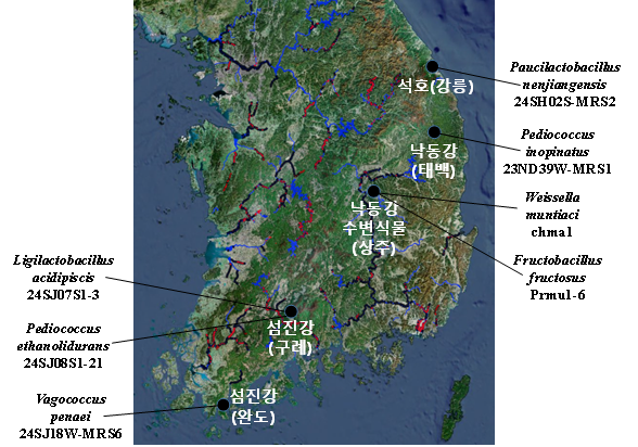 발견된 종은 섬진강 유역에서 페디오코커스 에탄올리듀란스, 리지락토바실러스 애시디피시스, 배고코커스 페나에이 3종, 낙동강 유역에서 페디오코커스 이노피나투스 1종, 강릉 석호에서 파우시락토바실러스 넨지앙엔시스 1종, 애기똥풀에서 웨이셀라 문티아시 1종, 매실나무꽃에서 프럭토바실러스 프럭토서스 1종이다.