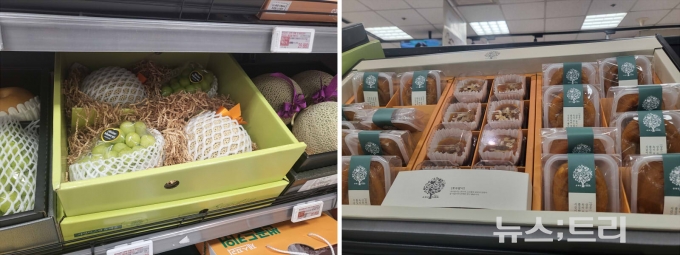 현대백화점 식품관 매장에서도 상자 형태의 과일 선물세트에 스티로폼 완충제를 사용하고 있었다. 바구니 형태의 선물세트에서도 망고 등 무른 재질의 과일에는 스티로폼 완충제가 빠지지 않았다.