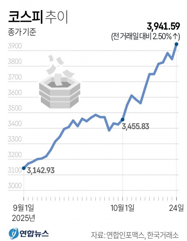 지난 23일 장중 3900을 터치했던 코스피가 24일 장 초반부터 3900선을 넘더니 결국 3941.59라는 사상 최고점으로 장을 마감했다. 이는 전일 대비 96.03(2.50%) 오른 수치로, 장중에 3951까지 치솟는 모습을 보이기도 했다. 코스닥도 11.05포인트(1.27%) 상승한 883.08로 마감했다.