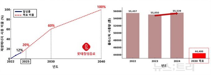 ▲롯데칠성의 재생에너지 사용비율(좌)과 플라스틱 사용량 ©newstree