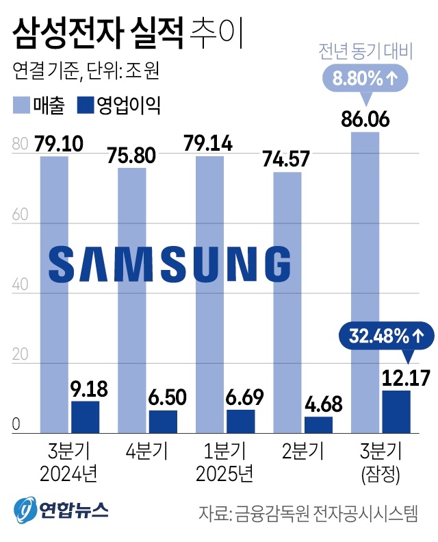 삼성전자가 올 3분기 연결기준으로 매출 86조1000억원, 영업이익 12조2000억원을 달성했다고 30일 밝혔다. 전사 매출은 전분기 대비 15% 증가하며 역대 최대 분기 매출을 기록했다.