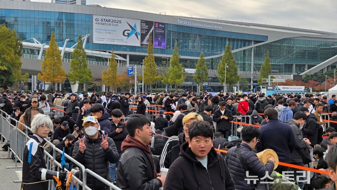 '지스타 2025'가 열리는 부산 벡스코 입구는 아침 일찍부터 전시장 문이 열리기를 기다리는 사람으로 북새통을 이뤘다. 오전 9시 무렵이 되자, 사람들이 점점 몰리면서 대기줄은 점점 길어져, 줄은 수십겹으로 이어졌다.