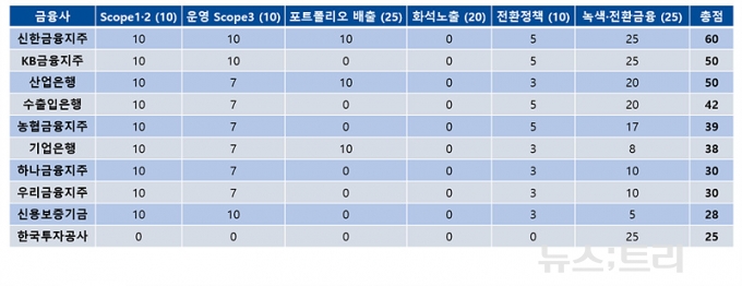 이번 평가는 각 기관이 최근 공개한 지속가능보고서와 기후관련 공식 공시를 바탕으로 △스코프(Scope)1·2 △운영기반 스코프3(출장·폐기물) △포트폴리오 배출(Financed Emissions) △화석연료 산업 노출 △탈석탄·전환정책 △녹색·전환금융 목표·실적 등 6개 항목으로 평가했다.