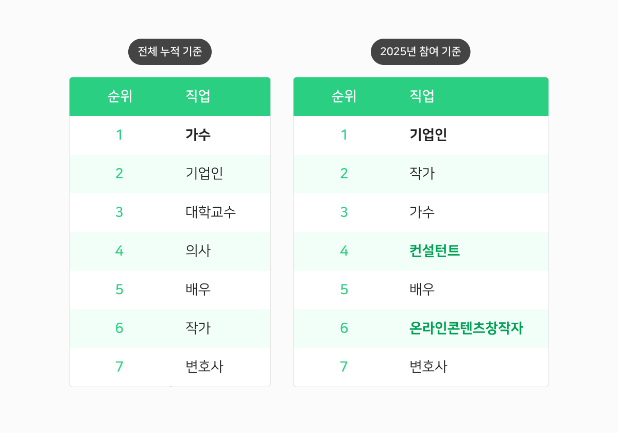 28일 네이버가 공개한 '인물정보 2025 트렌드'에 따르면, 올해 인물정보 신규등록과 업데이트 참여가 가장 많았던 직업은 기업인, 작가, 가수, 컨설턴트, 배우, 온라인콘텐츠창작자(크리에이터), 변호사 순이었다. 전체 누적으로 보면 가수, 기업인, 대학교수, 의사, 배우, 작가, 변호사 순이다.