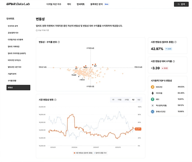 먼저 업비트 종합지수의 최근 30일의 수익률이 어떤 폭으로 움직였는지 숫자로 보여주는 변동성 지표를 제공한다. 일별 수익률의 표준편차를 연 기준으로 환산해 디지털자산 시장 전반의 변동성을 정량적으로 보여준다. 또 변동성–수익률 분포 차트도 제공한다. 이 차트는 개별 자산의 위험 대비 성과를 시각화하며 변동성 대비 수익률이 평균보다 높은 자산은 주황색 점으로 구분 표시해 시장 평균 대비 상대적 위치를 한눈에 비교할 수 있도록 지원한다.