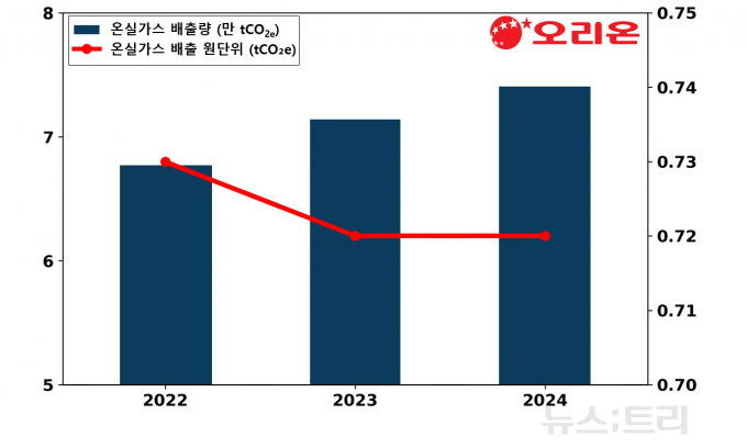 오리온이 공개한 국내 스코프1·2 온실가스 배출총량은 2022년 6만7703톤에서 2024년 7만4067톤으로 2년 사이에 9.4% 증가했다. 2024년 배출량은 2023년과 비교해도 약 3.7% 늘었다.