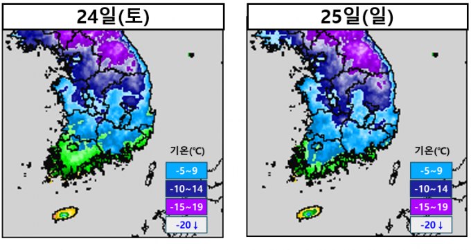 토요일인 24일 최저기온은 -18∼0℃, 최고기온은 -5∼6℃로, 이날은 전국 곳곳에 눈까지 내리겠다. 새벽까지 충청권과 전라권, 경상서부내륙에, 아침까지 전라서해안에 눈이 내리겠다.