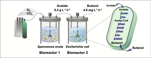연구팀이 개발한 시스템은 두 미생물의 반응을 마치 공장의 연속 생산라인처럼 연결해 바이오부탄올을 생산하는 공정이다. 먼저 이산화탄소 흡수율이 좋은 미생물 '아세토젠균'이 흡수한 이산화탄소를 수소와 결합해 생산한 아세트산(CH₃COOH)을 대장균이 먹도록 한다. 아세트산을 섭취한 대장균은 부탄올(C₄H₉OH)을 만들어낸다. 두 가지 미생물을 이용한 2단계 공정으로 친환경 연료를 만들어내는 것이다.