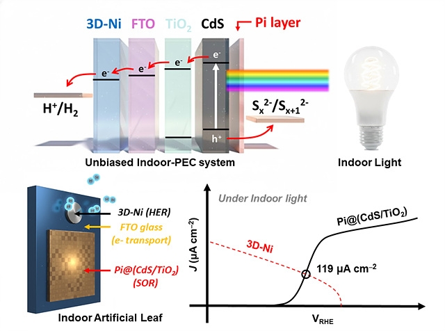 황화물은 강한 빛에 노출되면 '광부식' 현상이 일어나는데 약한 실내 조명은 이를 최소화할 수 있다. 연구팀은 빛이 약해 줄어든 전하 입자량을 보완하기 위해 황화물에 이산화티타늄이 접합된 전극 구조를 설계했다. 이 접합 구조는 양전하 입자와 음전하 입자가 재결합해 사라지는 것을 막아 한정된 전하를 재결합 손실 없이 온전히 수소 생산에 쓰게 만든다. 또 황화물 표면에 '인산염(Pi)'을 코팅함으로써 황화물의 광부식은 막고 전하 이동 속도는 높여, 내구성과 효율을 동시에 잡았다.