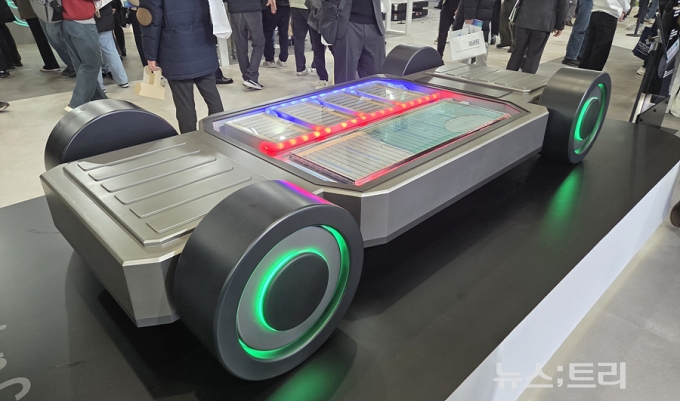 ▲인터배터리 2026에 전시된 SK온 전기차용 '액침냉각 팩 모형' ⓒnewstree
