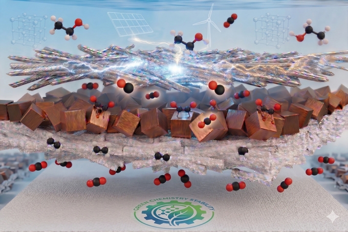 국내 연구진이 이산화탄소를 플라스틱을 만드는 원료인 에틸렌과 같은 화학물질로 전환하는 효율을 86%까지 높이는 전극구조를 개발하는데 성공했다.