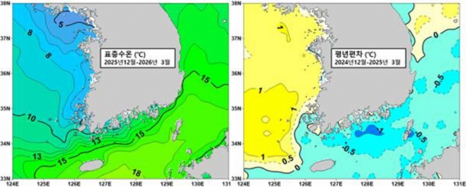 국립수산과학원은 2025년 12월부터 2026년 3월까지 우리 바다의 평균 수온이 평년 대비 약 0.5~1.5℃ 높았다고 10일 밝혔다.